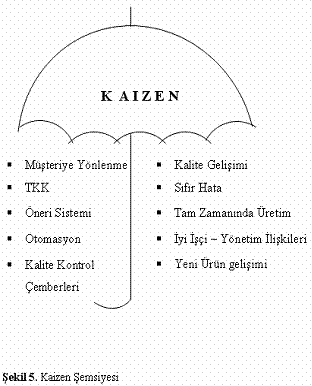 “Kaizen, Japonya’da gelişip sonradan bütün dünyaya yayılan bir çok yönetim uygulamasını (üretkenlik artırımı, TKK, kalite kontrol çemberleri) kapsayan bir şemsiyedir.”[9]