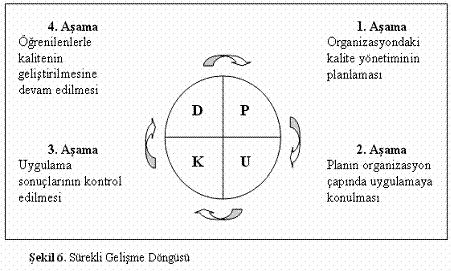 Sürekli İyileştirme İlkesi; 1. Durumun tespiti, 2. Sorunların giderilmesi, 3. Daha iyinin aranması, 4. Daha iyinin uygulanması, 5. Yukarıdaki sürecin tekrarlanmasını içerir.