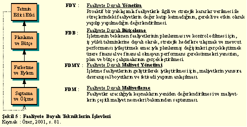 2.3.2. Faaliyete Dayalı Teknikler Faaliyete dayalı tekniklerin temel felsefesi, kaynakların maliyet nesneleri tarafından değil, onların tamamlanması sırasında kullanılan faaliyetler tarafından tüketildiğidir. Bu felsefeden yola çıkılarak öncelikle hangi tür faaliyetlerin gerçekleştirildiği ve bu yüzden ne kadar kaynak tüketildiğini ortaya koymak için bir faaliyet çarpanına (kaynak belirleyicisine), bu faaliyetlerin hangi maliyet nesneleri tarafından tüketildiğinin ortaya koymak için ise, bir maliyet çarpanına (faaliyet belirleyicisine) ihtiyaç bulunduğunu söylemek mümkündür. Eğer böyle bir yapı gerçekleştirilmişse, o zaman X birim maliyet objesi için ne kadar kaynak tüketilmesi gerektiği ya da X kaynak tüketimi sonucu ne kadar maliyet nesnesinin elde edilmesi gerektiği sorularına cevap verilebilir. Bu yapı kullanılarak her faaliyetin ve sürecin performansı ölçülebilir, bu performansa dayalı olarak maliyetler ve böylece işletme, daha etkin bir biçimde yönetilebilir (Özer, 2001).