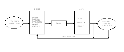 "Üretim: doğadaki kaynakların, insan ihtiyaçlarını karşılamaya yönelik mal ve hizmetler biçimine dönüştürülmesi için geliştirilen, fiziksel, kimyasal, mekanik vb. işlemler topluluğudur" (Samson,1991). Üretim sisteminin şekil 1’de gösterildiği gibi 5 temel bileşeni mevcuttur. Bunlar sırasıyla tüketicilerin istekleri, ürünün elde edilebilmesi için ihtiyaç duyulan girdiler, girdilerin anlamlı hale dönüştürüldüğü proses, prosesden elde edilen çıktılar ve tüketicinin tatmin edilmesidir (Acar, 1995).