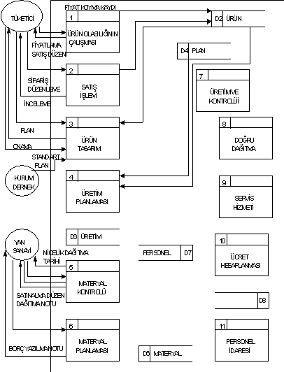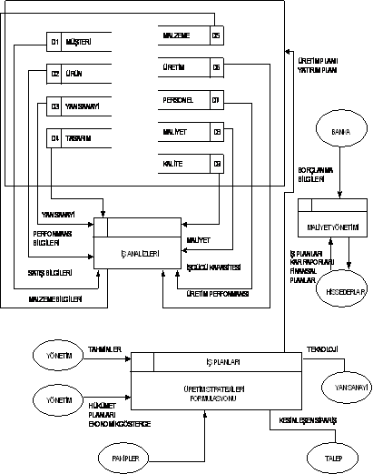 Genel iş sisteminin bilgi akışı Şekil 2'de gösterildiği gibi olup burada bahsedilen yapılarda ve modellerin geliştirilmesinde işletmenin tüm fonksiyonları göz önüne alınmıştır. Alt fonksiyonların organizasyonu (AFO) ve bilgi akışını (FBA) tanımlanmaktadır. Üretim stratejilerinin formülasyonu, rakipler, hükümet, talep, teknoloji ve yansanayi etkisi altında geliştirilecektir. Strateji geliştirmeyi etkileyecek diğer faktörler ise hissedarlar, bankalar, yönetim, maliyet ve finansal planlardan oluşacaktır (Wu,1994).