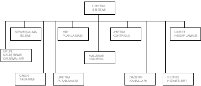 Üretim sistemin organizasyonu Şekil 3'de görüldüğü gibidir. Önerilen üretim sistemindeki birinci kademe, sipariş hazırlama işlemi, malzeme planlama, üretim kontrolu ve ürün maliyetlerinin belirlenmesidir. İkinci kademe, yeni ürün geliştirme, malzeme kontrolu, kapasite planları, üçüncü kademesinde ise ürün tasarımı, ayrıntılı üretim planlaması, dağıtım ve servis hizmetleri yer almaktadır.