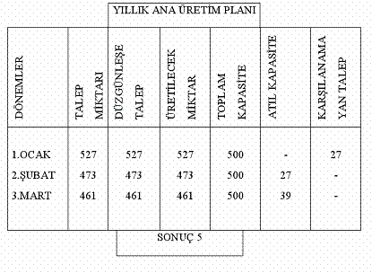 IV. Modül sonuçları: Tasarlanan yapının dördüncü modülü kapasite bilgileri ile talep tahminlerinin mukayese edilerek, taktik kararların üretilmesi işlemidir. Talep tahminleri üçüncü modülden elde edilirken, kapasite bilgileri normal mesai, yansanayi fazla mesai olarak ayrı ayrı sisteme girilmektedir. Taktik kararlara ilişkin Çizelge 3'deki örnekler incelendiğinde, kapasitenin veya Pazar payının yetersiz olduğu sonuçlarının yanı sıra ürün piyasa koşullarına uymayacağı vb. neticeler üretilmektedir.