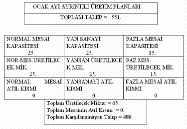 Ayrıntılı üretim planları Çizelge 5’de gösterildiği gibi olup, Çizelge 6’de gösterilen malzeme ihtiyaç planları aynı alt modül tarafından hazırlanmaktadır. Malzeme ihtiyaç planlaması normal ve fazla mesaide üretilecek miktarlara göre hesaplanmakta olup, yan sanayide üretilecek miktarlara ait ürünler için gerekli malzeme, hazırlanan listelere dahil edilmemektedir.