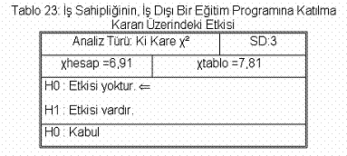 χ² analizi sonucuna göre, işletme dışı bir eğitim programına katılmada iş sahipliğinin etkisinin olmadığı görülmektedir. İşletme sahibi olup yöneticilik yapanlar da, başkasının işinde profesyonel anlamda yöneticilik yapanlar da genellikle işletme dışı bir eğitim programına katılmıştır. Bu durum, kendi işletmesinde yöneticilik yapan kişilerin de kendilerini geliştirmeye ihtiyaç duyduklarını ve bunu işletme dışı eğitim etkinlikleri ile giderdiklerini göstermektedir.