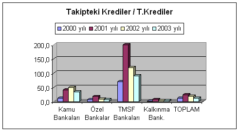 Takipteki kredilerde TMSF bankaları 2000 Kasım krizinden itibaren günümüze gelinceye değin Türk Bankacılık Sisteminde sorun olmaya devam etmektedir. Kamu bankaları daha çok etkilenmiştir. 2002 yılında yüzde 49’lara yükselmişken sonraki yıl azalsa da 2000 yılındaki yüzde 12,5 oranını yakalamıştır. Mevduatlara bakıldığında bir önceki döneme göre yüzde 13 artarak 160.812 Trilyon yükselmiştir. TL cinsinden yüzde 36 artarak 81.592 Trilyon TL, Yabancı Para cinsinden yüzde -4 azalarak 79.220 Trilyon TL olmuştur. Toplam mevduat içinde özel sermayeli bankaların payı yüzde1 azalarak yüzde 57’ye düşmüş, kamu sermayeli bankaların payı yüzde 4 artarak yüzde 38’ e yükselmiştir.