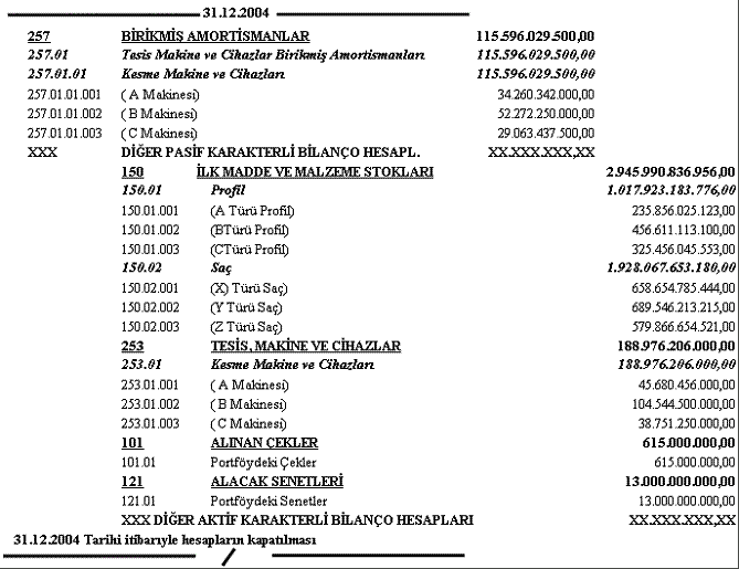 Yukarıdaki açıklamalar çerçevesinde Dönüşüm A.Ş. işletmesinin 31.12.2004 tarihi itibariyle hesapların sıfırlanması amacıyla yapacağı “Kapanış Kaydı” şu şekilde olacaktır.