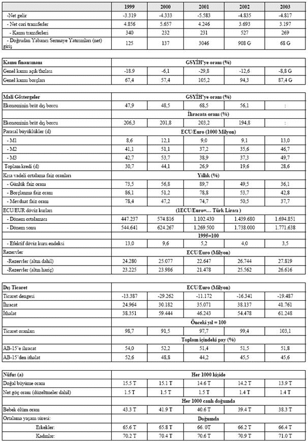 Döviz kurları: ECU döviz kurları ECU’nün yerine Euro’nun benimsendiği 1 Ocak 1999 tarihinde DG ECFIN’ye resmen bildirilen oranlardır. Euro döviz kurları, Avrupa Merkez Bankasının referans oranlarıdır. Eurostat’a bildirildiği şekliyle, efektif döviz kuru endeksleri (1994:100) % 50 ABD Doları + % 50 Euro olarak ağırlıklandırılmıştır. Efektif döviz kuru endeksi (reel), Eurostat’a bildirildiği gibi, başlıca ticari ortaklara göre ağırlıklandırılmıştır. Rezerv varlıklar: Eurostat’a bildirilen yıl sonu stok verileridir. Bu varlıklar, Merkez Bankalarının altın, döviz varlıkları, Özel Çekme Hakları, Uluslararası Para Fonu rezerv pozisyonları ve ülkede yerleşik olmayanlardan diğer alacakların toplamı olarak tanımlanmıştır. Altın, üç aylık piyasa fiyatından hesaplanmaktadır. 161