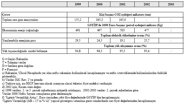 Çevre Toplam sera gazı emisyonları: Bu gösterge sera gazlarının antropogenik emisyonunu belirtmektedir. Bu gazlar, Küresel ısınma potansiyellerine (GWP) göre ağırlıklandırılan, karbon dioksit (CO2), azotdioksit (N2O), metan (CH4) ve üç halokarbon yani hidroflorokarbon (HFCs), perflorokarbon (PFCs) ve sülfür heksaflorid (SF6)’dir. GWP, farklı gazların 100 yıllık bir zaman ufku içinde küresel ısınmaya katkıda bulunma yeteneğini ifade eder. GWP’ler Hükümetler Arası İklim Değişikliği Paneli’nde ortaya konmuştur. Rakamlar CO2 eşdeğeri olarak verilmiştir. Sera gazı emisyon tahminleri Hükümetlerarası İklim Değişikliği Paneli (IPCC) Kılavuzlarındaki Tier 1 yaklaşımı kullanılarak yapılmıştır. Karbondioksit (CO2), Azotdioksit (N2O), metan (CH4), azotoksitler (NOx), karbonmonoksit (CO) gibi Antropojenik emisyonlar, NMVOC emisyonları, enerji üretimi, sanayi işlemleri, yakıtların yanması, tarım tesisleri için hesaplanmaktadır. Bunların yanısıra, sülfürdioksit (SO2) ve parçacık madde emisyonları sanayi sektörü için olan IPCC ve CORINAIR metodolojilerindeki faktörler kullanılarak hesaplanmaktadır. Hidroflorokarbon (HFCs), Perflorokarbon (PFCs) ve Sülfürheksaflorid (SF6) halokarbonlarının emisyonları veri yetersizliği nedeniyle henüz hesaplanmamıştır.