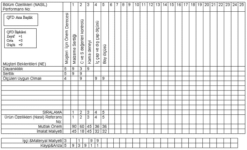 7. QFD'nin YararlarıBir ürün geliştirme süreci ender olarak herhangi iki ürün için aynıdır. Bu yüzden daha uzun tasarım dönüşümleri, daha fazla ürün problemleri ve daha yüksek maliyet ortaya çıkar. Bu prosesi kısaltma ve daha rekabetçi ve daha üretilebilir tasarım oluşturmada iki anahtar ise ürünün daha iyi dizayn edilmesi ve dizayn prosesinin daha iyi dökümante edilmesidir[6]. QFD'yi kullanarak bir ürünü tanımlama uzun zaman alır. Ancak toplam dizayn süresi kısaltılır, çünkü öncelikler erken bir şekilde belirlenir, dökümantasyon ve iletişim iyileştirilir. Planlama ve iletişim olaylarının bir kümesi QFD, organizasyon içinde yeteneklere odaklaşır ve onları koordine eder. Müşterinin satın almak istediği ve satın almaya devam edeceği malların önceden dizaynına ve pazarlamasına yönelir. Kalite evinin esası müşterinin istek ve beklentilerini karşılayan ürünlerin dizayn edilmesi düşüncesidir. Böylece pazarlamacılar, dizayn mühendisleri ve üretim elemanları ürünün daha fikir aşamasından itibaren birlikte çalışmak zorundadırlar[7]. Yapısal planlama araçlarının kullanımı sayesinde prosese bir disiplin yerleştirilir. Böylece sağlanan net sonuç, kritik kalemlerde yeniden dizayn işleminin yok edilmesi ve tüm mühendislik değişikliklerinde önemli azalmanın sağlanmasıdır Sonuç olarak QFD müşteri tatminini ve pazar payını artırarak, daha iyi ürün üretilmesini sağlar.QFD aracılığı ile yönetimde daha fazla etkileşim sağlanır. Bu şemaların incelenmesi kolaydır. Eğer insan gücü, zamanlama veya bütçe gibi diğer talepler mühendislik karar verme prosesi için seferber edilirse QFD’nin sonuçları açıkça görülür. 8. Tepkisel Problem Çözmeye Karşı Önlemeyle Ürün GeliştirmeÖnlemeye yönelik organizasyonlarda kaynakların kullanımı, tepkisel organizasyonlara göre çok daha uygundur. Önlemeye yönelik organizasyonlar enerjilerini ürün geliştirmeye harcarlar ve organizasyonel uyuma odaklanma söz konusudur. Ayrıca planlama ve problemleri önleme önceliklidir. Sonuç olarak üretimde daha az problemle karşılaşılır ve üretimdeki problemleri çözmeye daha az kaynak ayrılır. Tepkisel problem çözmeye yönelik şirketlerde, zamanın ilerlemesiyle değişim sayısı artar ve ürüne yönelik problemlerle karşılaşılır. Buna karşılık önlemeye yönelik şirketler çok az değişiklikle karşılaşır. Ayrıca %90`dan fazla değişiklik ürünün başlamasından bir yıl önce bitirilir[8]. 9. QFD’yi Uygulama AlanlarıQFD, takım kutusundaki aletlerden yalnızca bir tanesidir ve uygun olduğunda kullanılmalıdır. QFD’nin ne zaman kullanılacağına ilişkin bazı anahtar ifadeleri şu şekilde sıralamak mümkündür[9]; Ürün, hizmet ve yazılımdan müşteri memnun değil ve şikayet ediyorsa, Pazar payı sürekli azalıyor ve pazar büyüyorsa,Aşırı tasarım tekrar problemleri çözme geliştirme zamanının çok uzamasına neden oluyorsa,Ürün geliştirme fonksiyonları arasındaki kötü iletişim varsa, Ürün geliştirme kaynaklarının kullanımda eksiklik söz konusu ise,Ürün geliştirme takım çalışmalarının verimliliğinin azalması durumunda ise kullanılır[10].QFD, geniş ürün geliştirme senaryolarına uygulanabilen güçlü esnek bir yaklaşımdır. QFD'yi uygulamak üzere inceleyen organizasyonlar özellikle başlangıç aşamalarında danışmanlardan faydalanmalıdır.QFD yaklaşımı, yeni ürünler tanıtmanın dışında mevcut ürünleri gözden geçirmek için de bir araç olarak kullanılabilir. Yeni bir ürün için ekip hemen hemen açık bir amaç ile yola çıkar ve ürün karakteristikleri, geliştirme metotları, üretim işlemleri ve destek stratejileri konusundaki tüm kararları müşteri değerlerinin yönlendirdiğinden emin olabilir. Mevcut bir ürün iyileştirmede, QFD kullanıldığında ekip mevcut prosesler tarafından sınırlandırılır; fakat aynı kurallar geçerlidir[11]. 10. 1012. Ordudonatım Ana Tamir Fabrikasında Silindir Gömleği İçin QFD UygulamasıSilindir blokları, motorun bütün parçalarına yataklık yapan ve bütün parçaları üzerinde taşıyan blok gövdedir. Silindirler ise içerisinde çalıştıkları pistonlara yataklık yaptıkları elemandır, bunlara silindir gömlekleri de denilir. Piston, silindir içerisinde doğrusal hareketi ile emme ve egzoz işlemini yapan elemandır[12]. Silindir gömlekleri içten yanmalı motorlarda, silindir blokuna takılan, içinde pistonun hareket ettiği ve yakıtın yandığı, silindir biçiminde makine elemanlarıdır. TSE 482’ ye göre ; Yaş silindir gömlekleri, takıldıkları silindir blokunda dıştan (motor soğutma suyu) su ile soğutulan gömleklerdir. Kuru silindir gömlekleri, takıldıkları silindir blokunda soğutma suyu ile direkt temas etmeyen gömleklerdir. Silindir içinde meydana gelen aşınmaları bertaraf etmek için silindir % 0,10 taşlanarak piston değiştirilir. Bu taşlama zaman içinde en fazla 4 defa yapılabilir, yani % 0,40 dan fazla olduğunda uygun piston bulunamaz. Aşama 1 Bu örnekte, üretilecek olan bir silindir gömleğidir. Çalışmamız, askeri bir fabrika olduğu için müşteride yine kendi personelleri yani silindir gömleği takılan araç kullanıcılarıdır. 1012 Ordudonatım Ana Tamir Fabrikasında Kalite Güvence Departmanı Atölye departmanı yetkilileriyle yaptığımız beyin fırtınası toplantısında teknik özellikler ve müşteri beklentileri belirlenmiştir. Aşama 2 Müşteri Beklentileri Dayanıklılık: Üretilen bir piston gömleğinin ortalama 24 ay görevini yerine getirmesi beklenir. Sertlik: Üretilen bir piston gömleği eğer çok sert olursa piston segmanı aşındırmaya başlar, eğer çok yumuşak olursa da piston gömleği aşınır[13]. Ölçüleri uygun olmalı: Belirlenen teknik ölçülerde olmalıdır. Teknik Özellikler Malzeme se