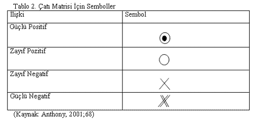 “Neden”, müşterilerin rakip işletmelerle yaptıkları değerlendirmleri göstermektedir. Ürün özellikleri, süreç özellikleri, süreç performans özellikleri rakiplerle karşılaştırılabilir. Müşteri gereksinimlerinin nasıl karşılanabileceğine karar verdikten sonra- böylece “Nasıl”- ilişki matrisinde “Ne” ve “Nasıl” bağlantısı tamamlanmış olmaktadır. Kalite evinin çatısı da bir ilişki matrisi oluşturmaktadır. Çatıda “Nasıl”ların farklı elemanları arasında herhangi ilişkinin olup olmadığını araştırılmaktadır. Bu matriste, pozitif ve negatif ilişkilerin olasılığı araştırılmaktadır. Diğer bir deyişle, kalite evinin çatısı mühendislik özellikleri arasındaki çelişkileri görünür kılmaktadır(24): “Bu çelişkiler, ürünün yaşam çevrimi boyunca ortaya çıkabilecek problemler için kritik alanlardır. Çelişkilerin çözümlenmesi için özel bir çaba gösterilmelidir”. Bu matris için bazı yaygın semboller, aşağıdaki Tablo 2’de olduğu gibidir.