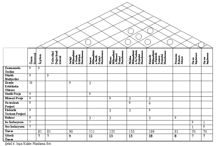 Yapılan çalışmada, bir evin inşası sırasında oluşturulan kalite planlama evinde, elektrik mühendisinin elektrik tesisatı projesini hazırlaması %18’lik önem derecesine sahiptir. Mimar mühendisinin mimari projeyi hazırlaması, %13’lük önem derecesine sahiptir. Makine mühendisinin su tesisatı projesini hazırlaması, %13’lük önem derecesine sahiptir. İnşaat mühendisinin statik projeyi hazırlaması, %11’lik önem derecesine sahiptir. Jeoloji mühendisinin zemin etüdünü hazırlaması, %9’luk önem derecesine sahiptir. Firmanın ruhsatı alması, %8’lik önem derecesine sahiptir. İş planı, %7’lik önem derecesine sahiptir. Tedarikçi değerlendirmesi, , %7’lik önem derecesine sahiptir. Dış ısı kaplaması, %7’lik önem derecesine sahiptir. Dış ses kaplaması, %7’lik önem derecesine sahiptir.