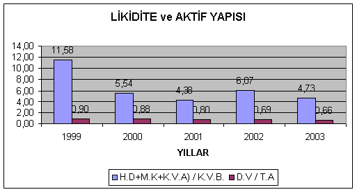 1) Likidite ve Aktif yapısı; Aracı kurumlar para ve benzerleri ile kısa vadeli borçlarını karşılayabilmektedir. Genelde incelenen beş yılda yüksek likidite yapısına sahiptir. 1999 yılında yüksek Likidite yapısına sahip olmasına rağmen 2000 yılında büyük bir düşüş yaşamıştır bunun nedenleri ise yaşanan krizler olup sonraki yıllarda ise bu oran aynı oranda gerçekleşmiştir. 2003 yılında likit haldedir.