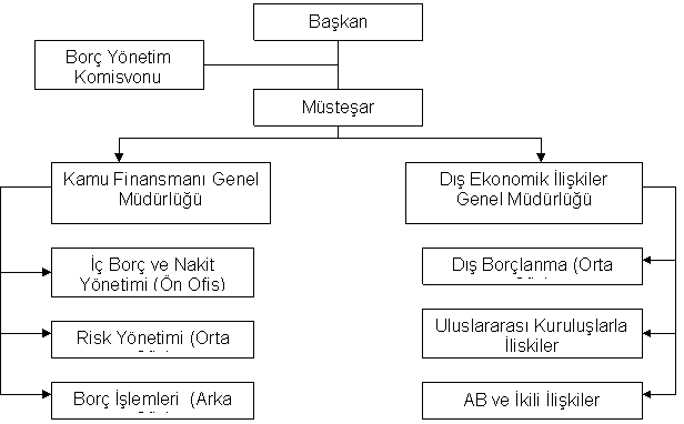 Bu birimlerden Dış Ekonomik İlişkiler Genel Müdürlüğü kamu kesimi borçlanması konusunda her türlü dış borçlanma işlemlerini gerçekleştirmek üzere örgütlenmiş bir yapıya sahip olup, dış borç yönetiminin temel fonksiyonlarından politika tespiti, operasyon ve analiz gibi işlemleri yerine getirmektedir. Kamu Finansmanı Genel Müdürlüğü ise, dış borçların kullanımının takibi, muhasebeleştirilmesi ve geri ödemesinden sorumlu birim olarak hizmet vermekte olup düzenleme, muhasebe, istatistiksel analiz gibi fonksiyonları yerine getirecek şekilde örgütlenmiştir (Sarı, 2004: 85).