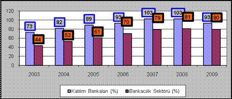 Katılım bankalarında toplanan fonların kullandırılma nispetini bankacılık sektörü ile karşılaştırmalı olarak gösteren Grafik 4’te de görüleceği üzere katılım bankaları 2003 yılından 2008 yılına kadar topladıkları fonları artan bir yüzdeyle kullandırmışlardır. 2003 yılında % 73 olan bu oran 2009 yılı için % 93 olarak gerçekleşmiştir.