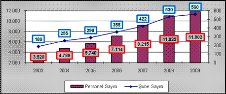 Bankacılık alanında şube ve sektördeki personel sayısı dikkat edilmesi gereken göstergelerden biridir. Katılım Bankalarının şube ve personel verileri grafik 8’de ele alınmıştır. 2003-2009 yılları arasında katılım bankalarına ait şube sayısı % 298, personel sayısı ise % 335 oranında artış göstermiştir. Katılım bankaları, 2009 yılı sonunda 560 şube ve 11.802 personel ile faaliyet göstermektedir.