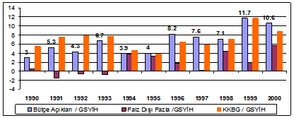 1989 yılından itibaren kamu kesiminin gelir gider dengesinin ciddi şekilde bozulmaya başlaması ile birlikte, 1990'dan itibaren, bütçe açığının GSYH’ya oranı giderek artmış ve kamu kesimi finansman açıkları ile birlikte kamu kesimi borçlanma gereği de yükselmiştir. Kamu kesimi borçlanma gereği (KKBG)/GSYH oranı, 1999 yılında yüzde 11.7 seviyesine çıkmıştır.